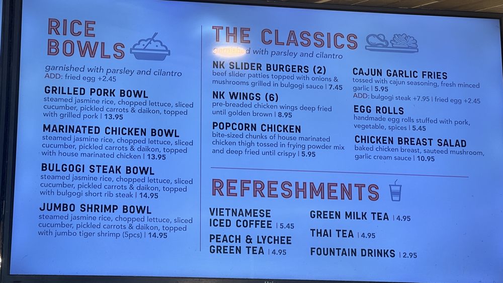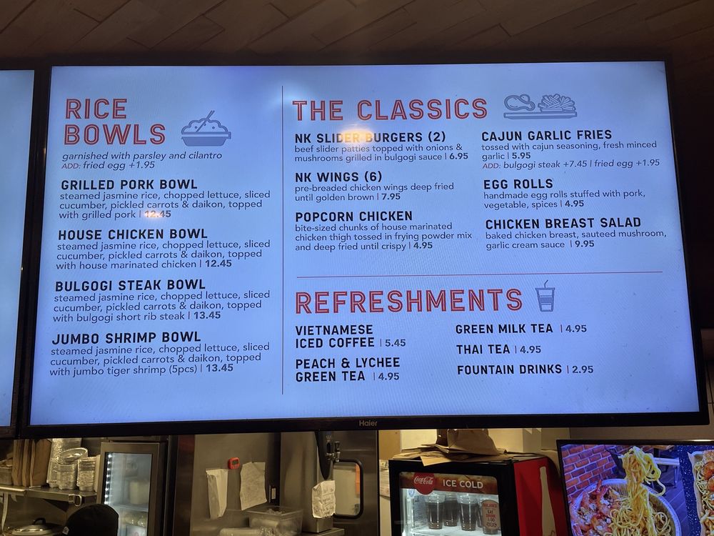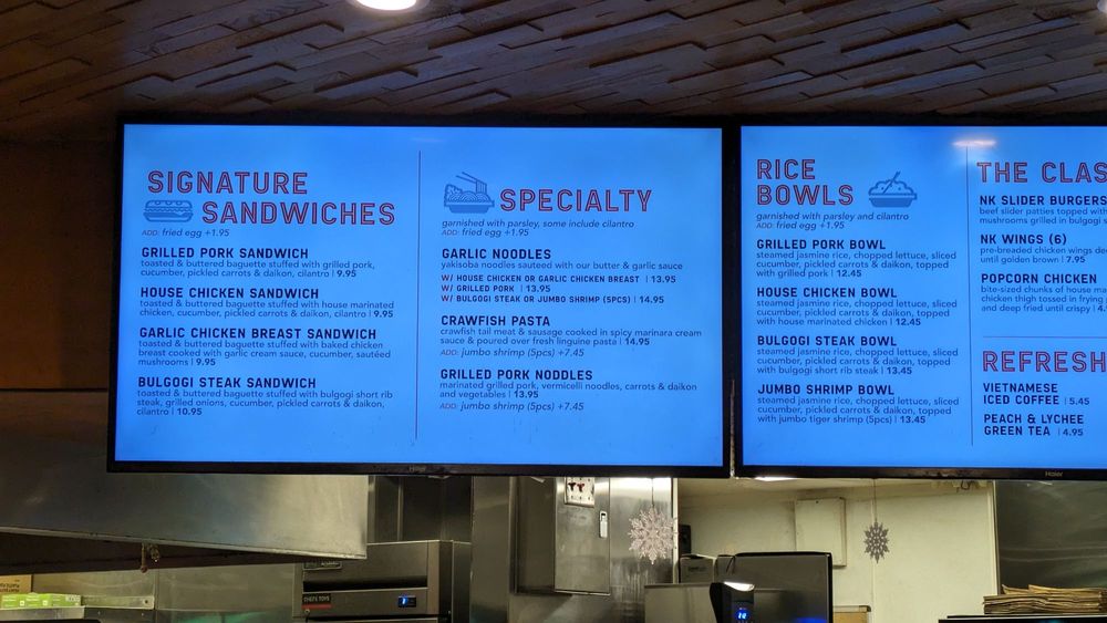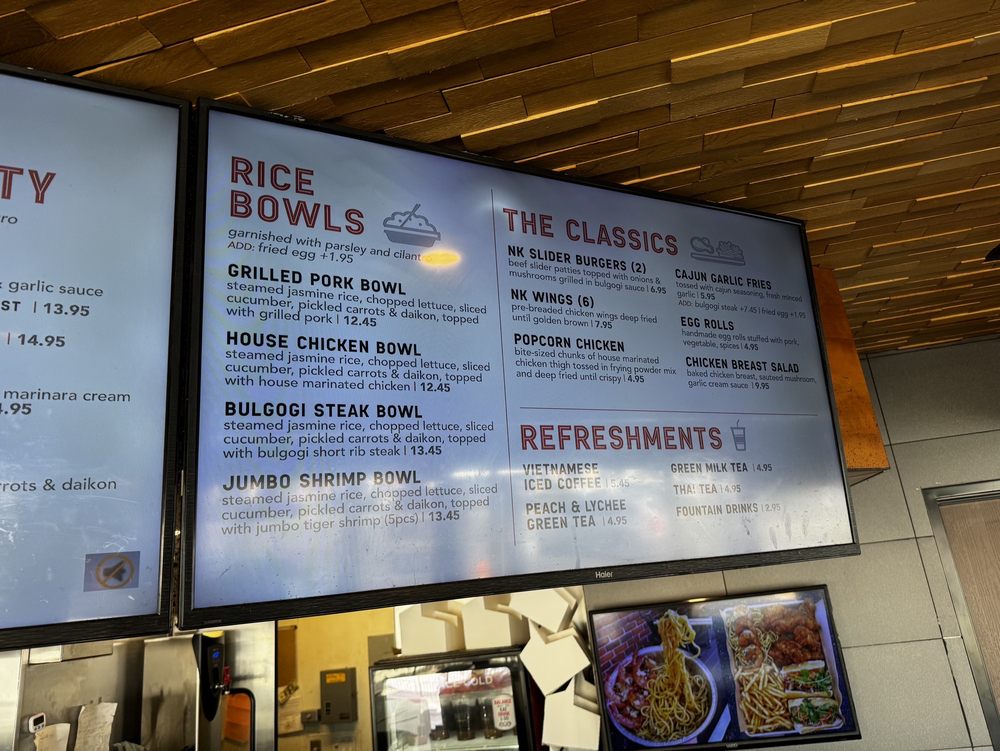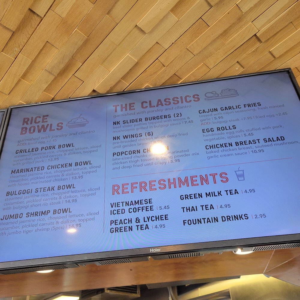 Nguyen's Kitchen in Orange, CA offers a unique blend of New American, Asian Fusion, and Vietnamese cuisine. With options for delivery, takeout, and reservations, this trendy yet casual spot provides a diverse menu with limited vegetarian options. From premium sandwiches like the Bulgogi Short Rib Steak to flavorful Noodles & Pasta dishes and classic favorites like Egg Rolls and Cajun Garlic Fries, there is something for every palate. Customers praise the friendly service, flavorful dishes, and generous portions at Nguyen's Kitchen. The Garlic Chicken Breast Sandwich stands out for its savory garlic cream sauce, while the NK Slider Burgers and Bulgogi Steak Bowl impress with their bold flavors. Prices are reasonable for the quality and quantity of food, making it a satisfying dining experience. Be sure to try their refreshing Peach & Lychee Green Tea for a delightful drink option.