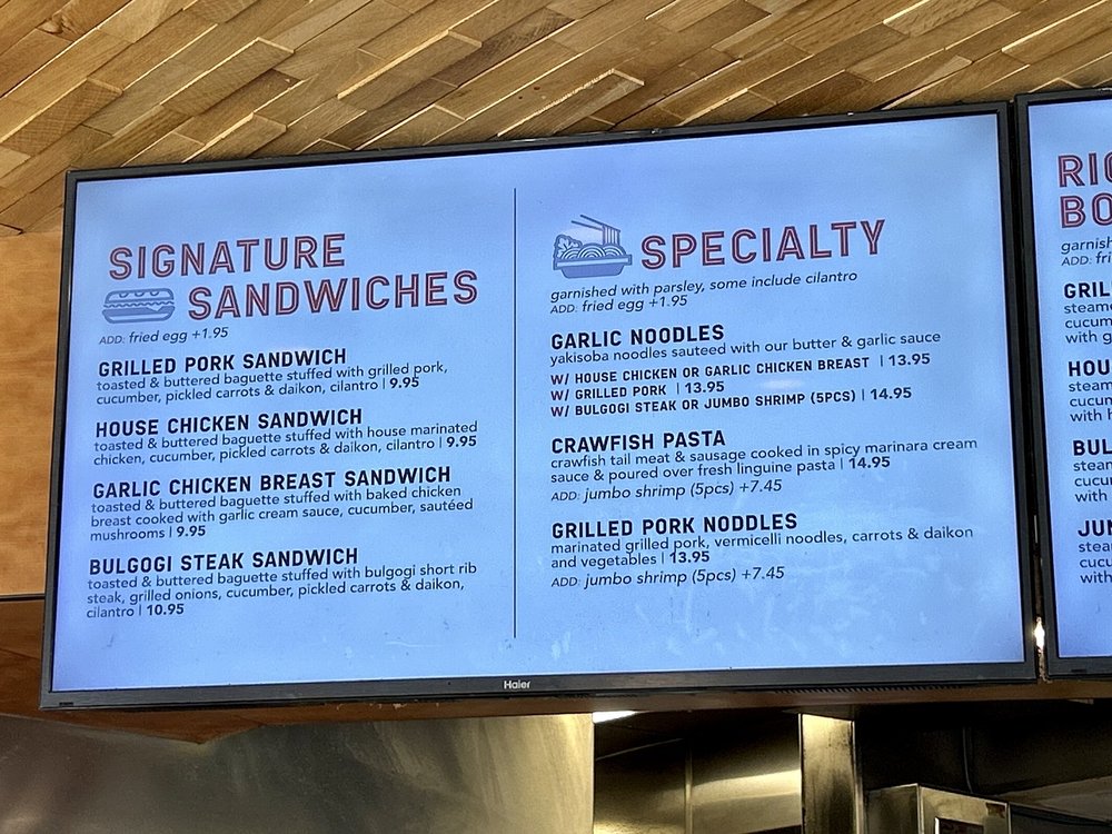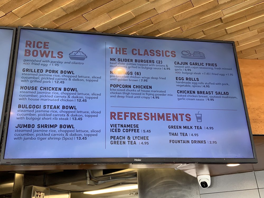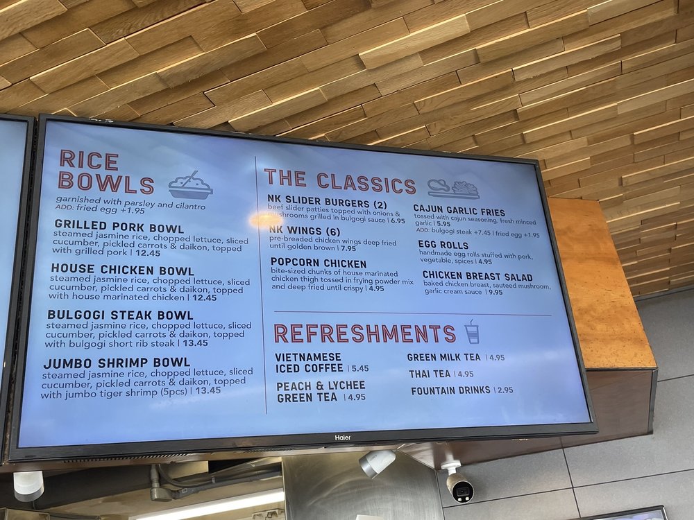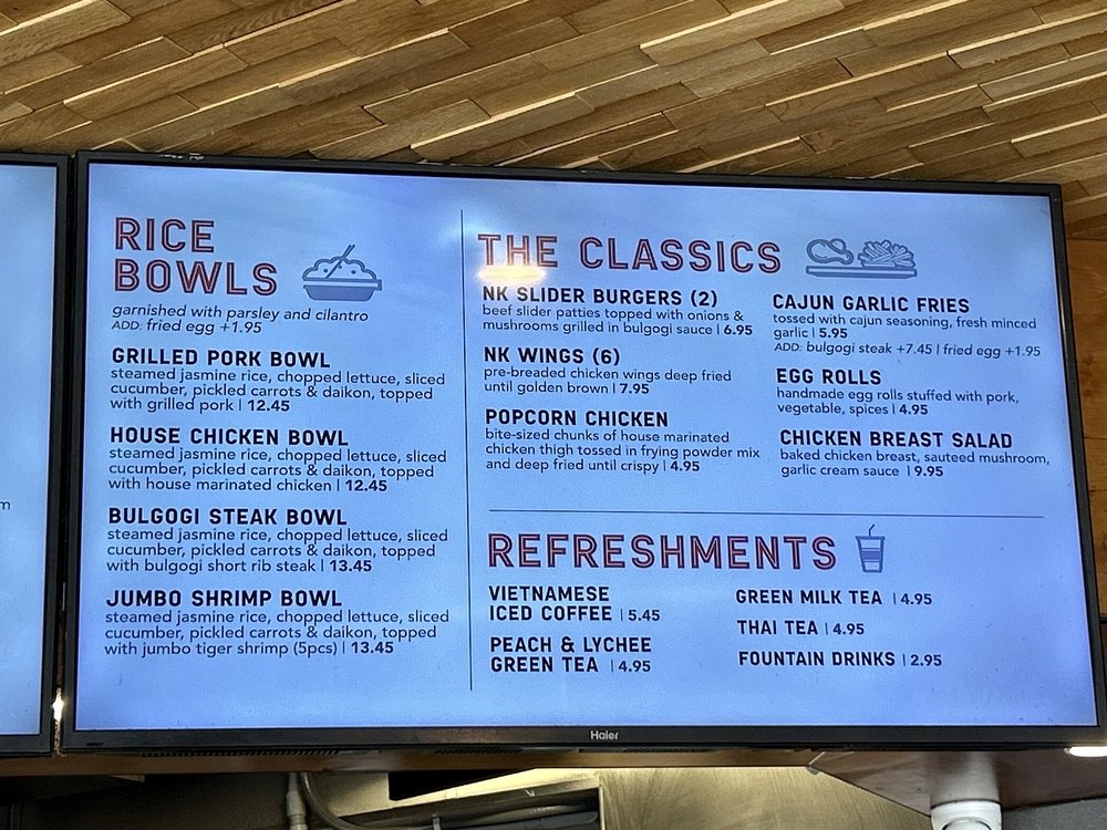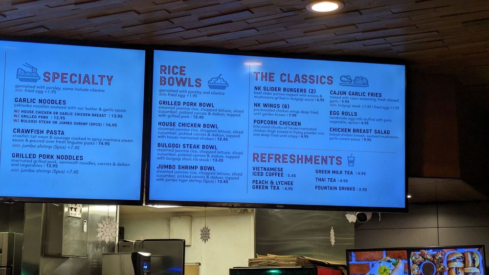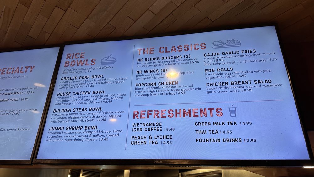 Nguyen's Kitchen in Orange, CA offers a unique blend of New American, Asian Fusion, and Vietnamese cuisine. With options for delivery, takeout, and reservations, this trendy yet casual spot provides a diverse menu with limited vegetarian options. From premium sandwiches like the Bulgogi Short Rib Steak to flavorful Noodles & Pasta dishes and classic favorites like Egg Rolls and Cajun Garlic Fries, there is something for every palate. Customers praise the friendly service, flavorful dishes, and generous portions at Nguyen's Kitchen. The Garlic Chicken Breast Sandwich stands out for its savory garlic cream sauce, while the NK Slider Burgers and Bulgogi Steak Bowl impress with their bold flavors. Prices are reasonable for the quality and quantity of food, making it a satisfying dining experience. Be sure to try their refreshing Peach & Lychee Green Tea for a delightful drink option.